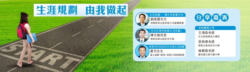 有見及此,明報教育出版有限公司特別就支援學校的生涯規劃工作,聯同坊間有志參與的機構,聯合提供了一系列生涯規劃支援服務,希望能夠減輕老師的工作負擔之餘,同時讓學生能夠更有效得到更新更貼的市場資訊。我們將會在2015 年5 月27 日(星期三)舉行生涯規劃發布會,誠邀 閣下及 貴校同工蒞臨指導,發布會中會向老師介紹以下服務: